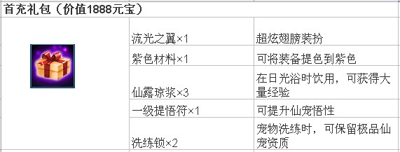 活动内容:从开服当日起,只要玩家的角色是第一次在所在服务器充值任意金额,除了能获得相应的元宝之外,还将会获得价值1888元宝“首冲礼包”一个!