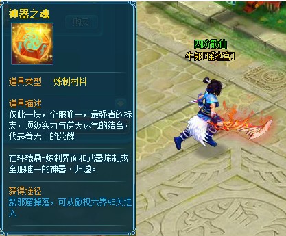 活动内容:通过傲视六界第45关后的秘层,将有一定几率获得全服唯一道具【神器之魂】,炼制全服唯一的神器【神器·归墟】!