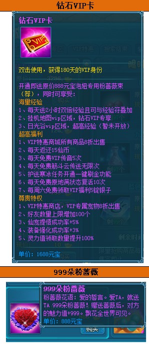 活动内容:玩家首次购买使用钻石VIP卡可额外获得【999朵粉蔷薇】,原价3288元宝的钻石VIP卡开服前三天商城限时抢购只需888元宝!予人鲜花,手有余香!