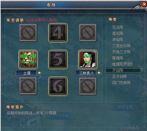 找到蓝色英雄真散仙,他头像旁边有一个特技传授,消耗1000银币学了它。好了继续主线任务,阵型还是万仙阵“虎威太岁”在最前面用“土遁”,然后是散仙用“三字劫”,最后是小龙女用大海;遇到对面不是3个怪时,散仙用“合击”,小龙女用“三昧真火”