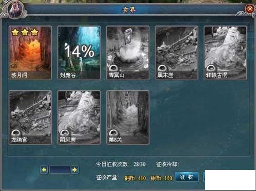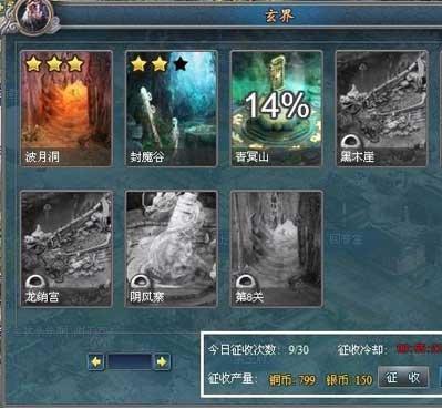 通过挑战玄界通关可以增加玄界进度。在玄界选择界面可以看到当前玄界进度以及可征收的产量。玄界征收次数每天都有上限,并且每次征收后会增加一定的冷却时间。当冷却时间超过1小时后,在冷却结束前将不能再征收。