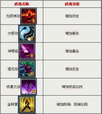 根据属性的不同,在8090《降龙十八掌》中,目前武魂共有15种,每一种武魂对应着不同的属性,根据英雄的优势属性来为每个英雄配备不同的武魂。每个英雄都有可供配备武魂的武魂槽,每个英雄有5个武魂槽,而如果是VIP6级的玩家,每个英雄可多拥有一个武魂槽。