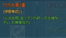 降龙十八掌内力反震心法感觉上有点破釜沉舟的感觉,降龙十八掌内力反震心法只能在血量低于33%的时候才会触发,如果是单挑这技能和霸道,但是群的话就有点不太好用了。