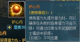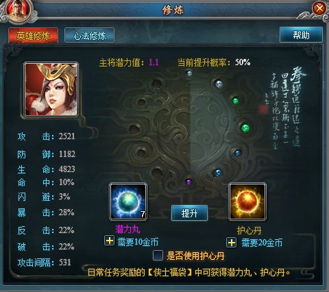 在提升到1.1的时候,主将的品质会达到紫色,此时提升成功的几率会降到50%。这时建议使用护心丹,保证提升失败潜力值也不会下降。护心丹的来源同潜力丸一样,可通过侠士福袋开出或者通过金币购买,20金币一个。