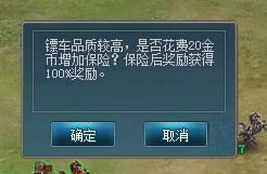 如果镖车的品质是前三种,即白色、绿色和蓝色的时候,可以直接运镖,而当刷新出紫色和橙色镖车之后,开始运镖时系统会提示购买保险。这里建议大家如果你是RMB玩家同时也不是对自己的实力又百分百信心的时候,建议可以保险,毕竟如果被人劫镖两次,就是一半的损失。而买了保险之后,同样可以被人劫镖,但是劫镖之后无损失。
