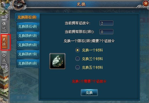 获得陨石方法:如下图所示,点击游戏下方导航中的强化——选择兑换,用征战令兑换陨石。