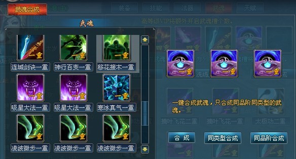 武魂合成方法:点击武魂合成,进入界面后可以选择同类型合成和同阶品合成。