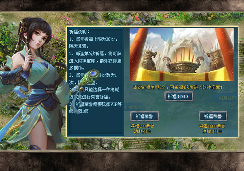 3、祈福宝箱:在这里各位大侠可以用金币来祈福荣誉,这里分别有两种祈福的方式,一种是用30金币祈福获得200荣誉,另一种是用100金币祈福获得1000荣誉。