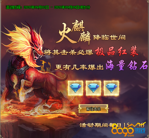 开服七天内火麒麟每日15:30准时降临世间,将其击杀必爆极品红装。