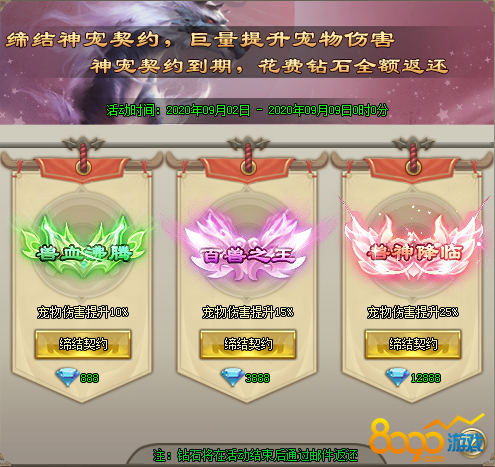 开服七天内,缔结神宠契约,提示巨量宠物伤害,契约到期花费钻石全额返还。