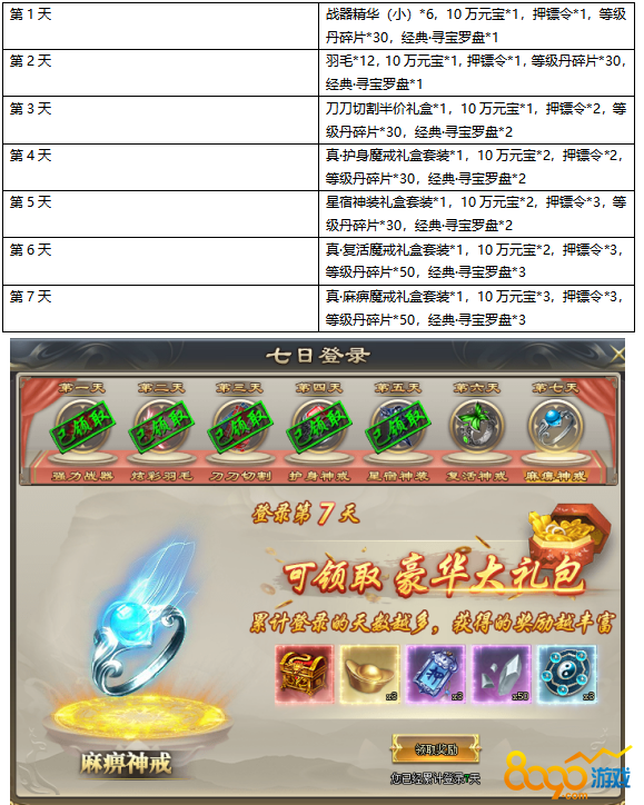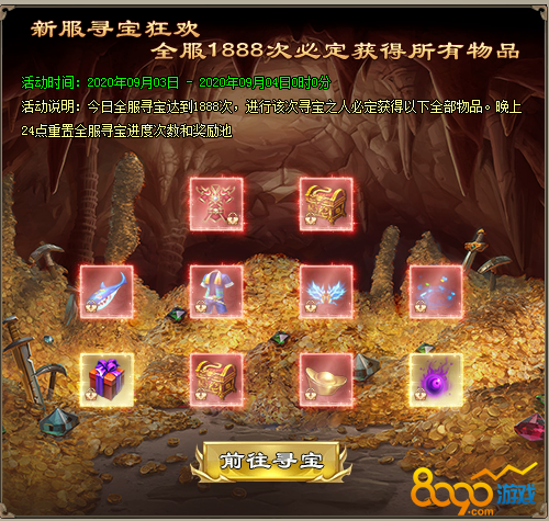 新服七天内的第3、4、5、6天开启,今日全服寻宝达到1888次,进行该次寻宝之人必定获得以下全部物品。晚上24点重置全服寻宝进度次数与奖励池。