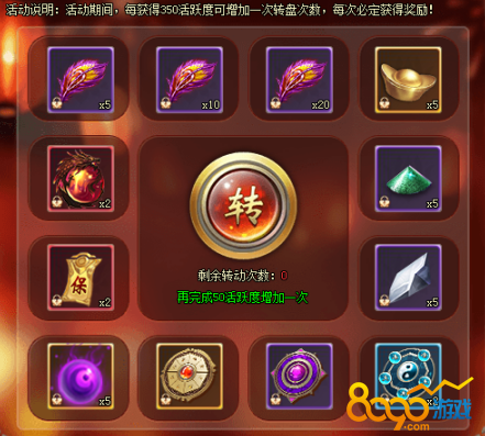 1、活动期间,每获得350活跃度可增加1次转盘次数,每次必定获得奖励。[游戏内显示为准,开服7天后开启]