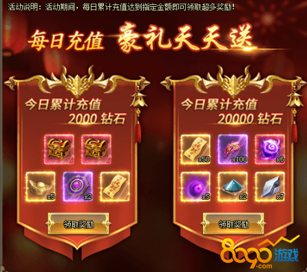 1、活动期间,每日累计充值达到指定金额即可领取超多奖励。[游戏内显示为准,开服7天后开启]