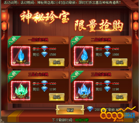 1、活动期间,神秘商店每2小时自动刷新,限时打折出售各种珍稀道具。[游戏内显示为准,开服7天后开启]