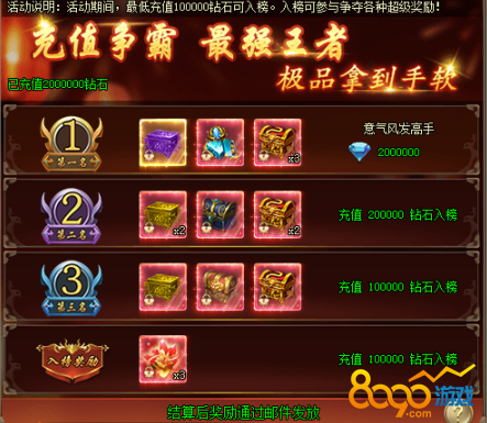 1、活动期间,最低充值100000钻石可入榜。入榜可参与排行榜争夺,获取超级奖励,奖励在活动结算后通过邮件发放。[游戏内显示为准,开服7天后开启]