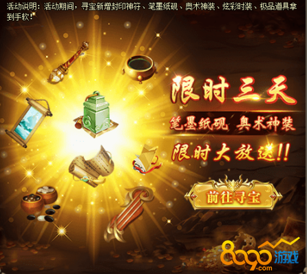 1、活动期间,寻宝新增封印神符、笔墨纸砚,极品道具拿到手软。[游戏内显示为准,开服7天后开启]