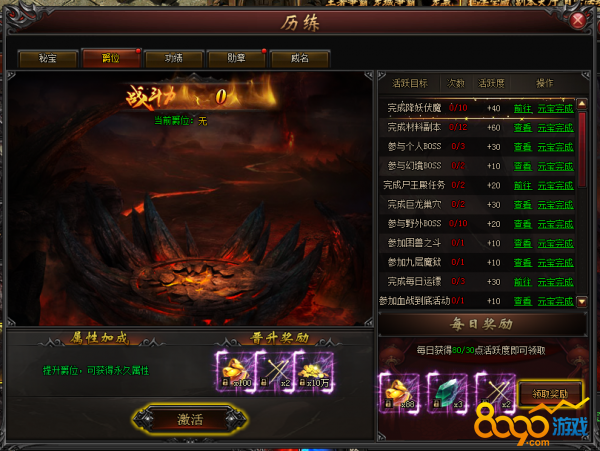 玩家激活秘宝千机锁即可开启爵位系统,玩家通过主界面的历练按钮进入爵位界面
