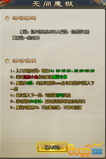 搜索"8090网页游戏"在我们降龙之刃的网页游戏中,无间魔狱活动可以获得我们意想不到的奖励,今天就让我们一起来了解一下无间魔狱活动怎么参加,活动规则是什么呢?