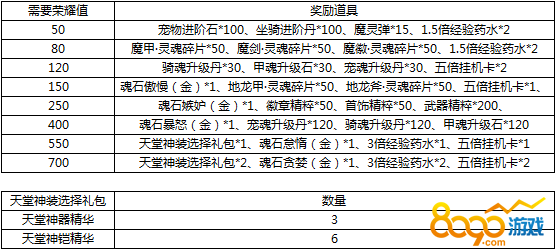 盛典荣耀:活动期间完成指定的荣耀事件即可获得荣耀值,累积到一定数量可获得对应的奖励,奖励如下: