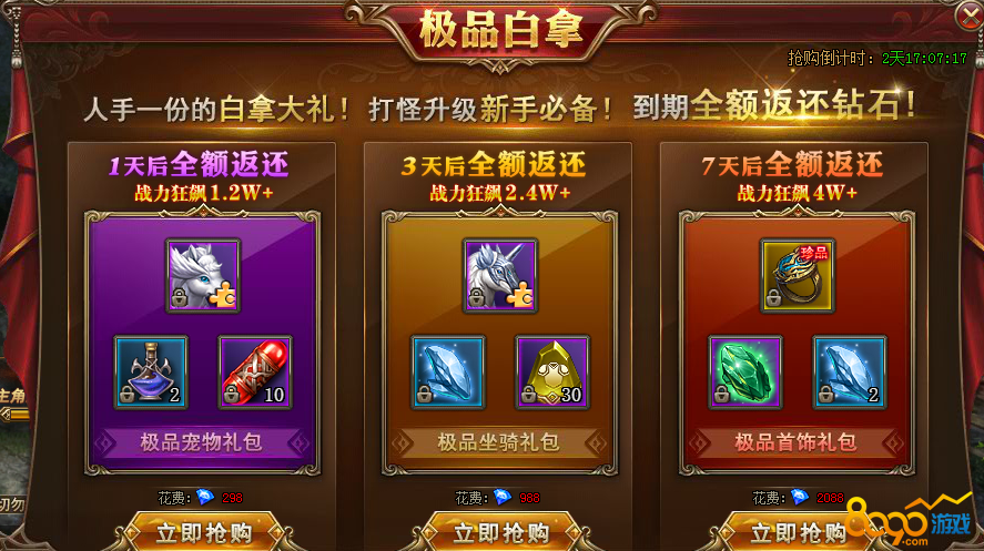 搜索"8090网页游戏"极品白拿是血盟荣耀中一个比较划算的活动,里面的装备是每个星期必备的,并且到期之后会返还购买礼包的钻石。