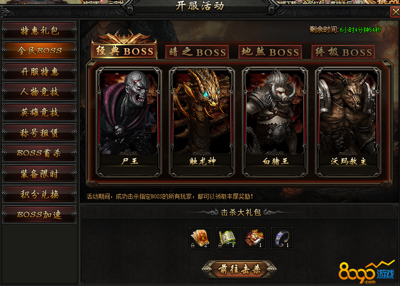 【活动内容】活动期间击杀特定BOSS组,会获得丰厚大礼。
