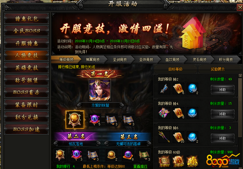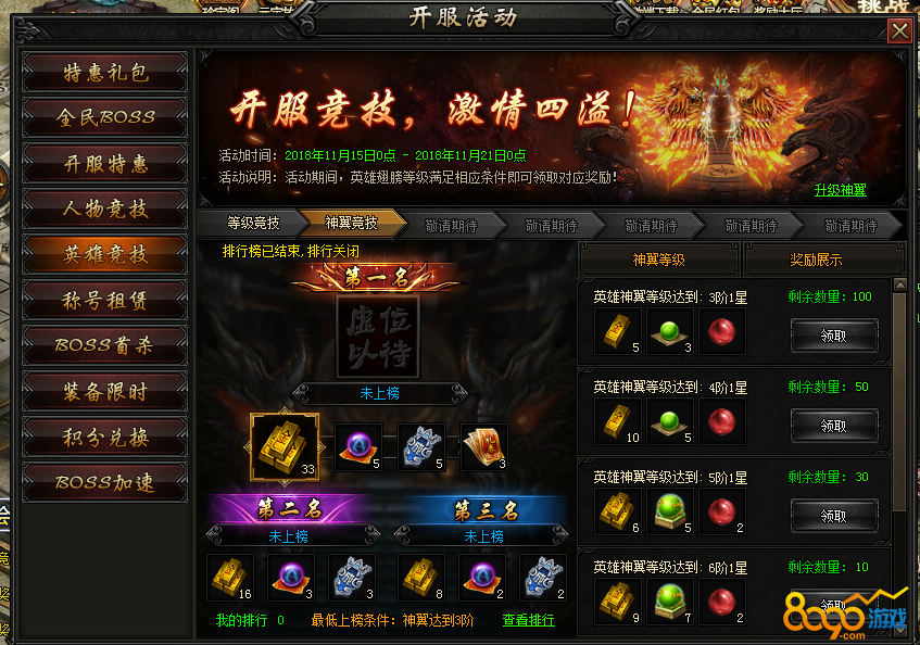 【活动内容】 活动期间,只要角色本身神翼等级达到系统要求等级即可在活动页面领取不菲的奖励。竞技排名更能获得高转装备宝箱!