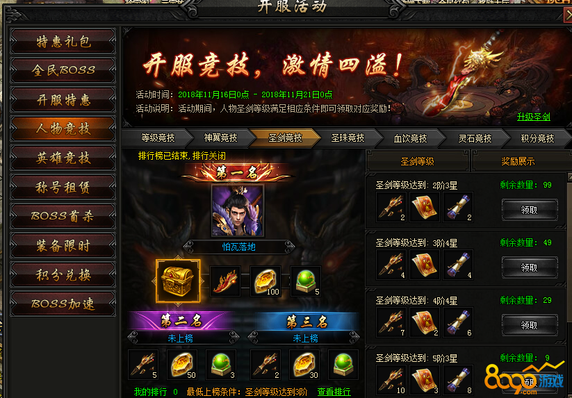 【活动内容】活动期间,圣剑等级达到系统指定等级即可领取圣剑豪礼。竞技排名更能获得高转装备宝箱!