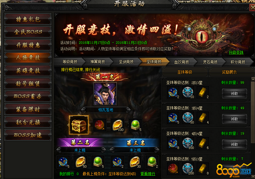 【活动内容】活动期间,圣珠等级达到系统指定等级即可领取圣珠豪礼。竞技排名更能获得高转装备宝箱!