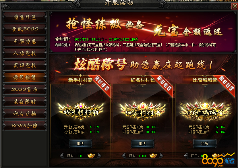【活动内容】活动期间可元宝租赁炫酷称号,开服第8天全额返还!