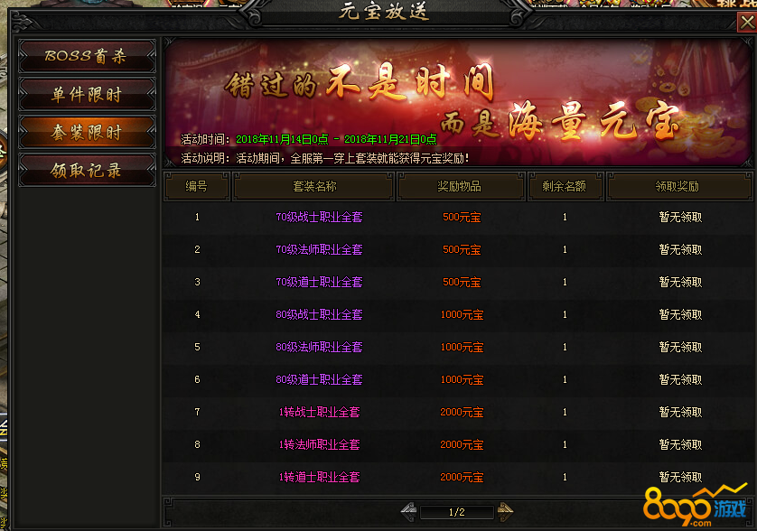 【活动内容】活动期间,全服首穿指定套装即可领取元宝奖励!