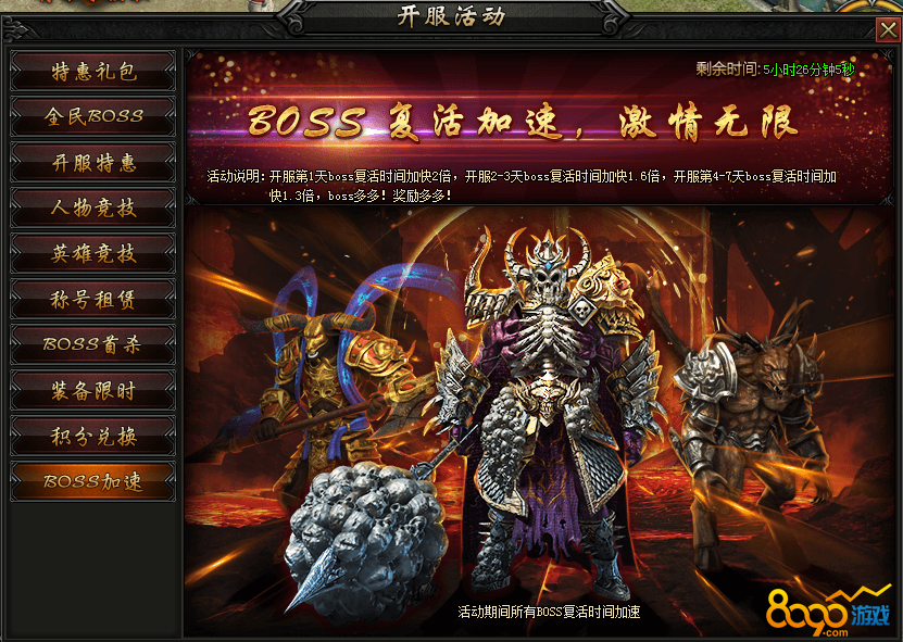 【活动内容】开服第1天BOSS复活时间加快2倍,开服2-3天BOSS复活时间加快1.6倍,开服4-7天BOSS复活时间加快1.3倍。BOSS多多!奖励多多!