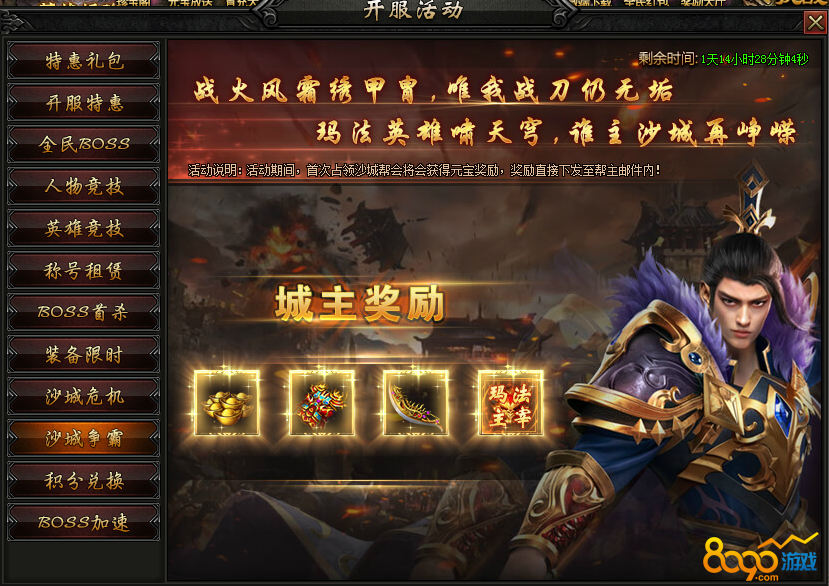 【活动内容】开服第三天晚上20:00~21:00系统自动开启攻城战,夺得沙城霸主,即可获得系统为您准备的精彩大礼一份。