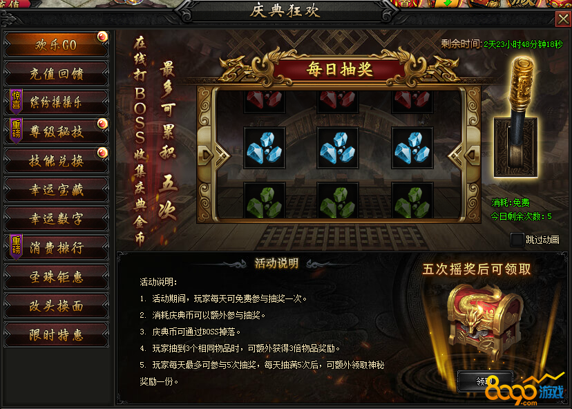 活动内容:活动期间,每天可以免费参与抽奖,打BOSS收集庆典币可以获得更多抽奖次数,惊喜奖励摇出来~