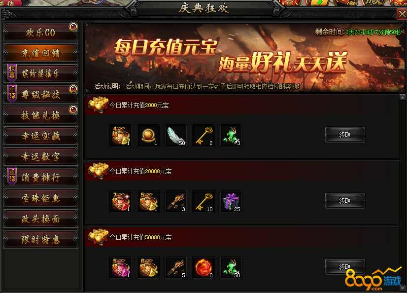 活动内容:活动期间,每日充值达到一定额度后可额外领取相应档位的充值回馈。