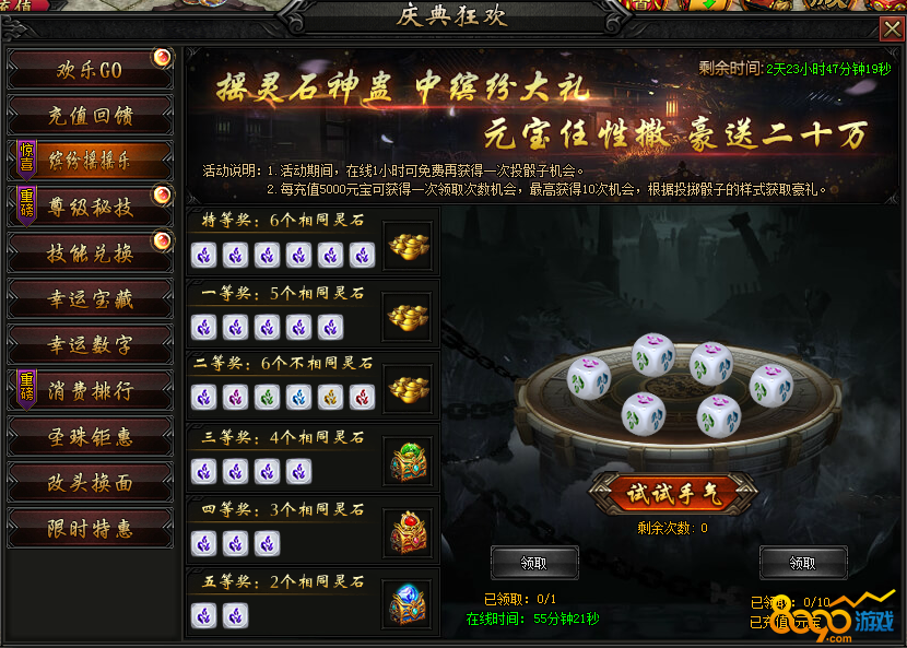 活动内容:活动期间,在线即可免费领取摇摇乐次数,充值额外赠送次数,100%中奖,最高可得20万元宝~