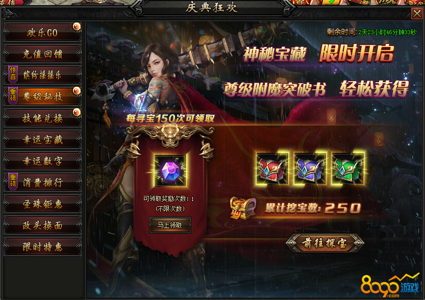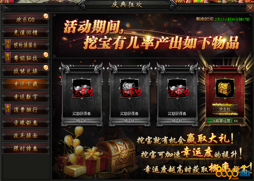 活动内容:活动期间,宝藏有几率额外产出海量元宝及8-10转极品本职业装备!额外幸运,额外大奖,等您来抢哦~