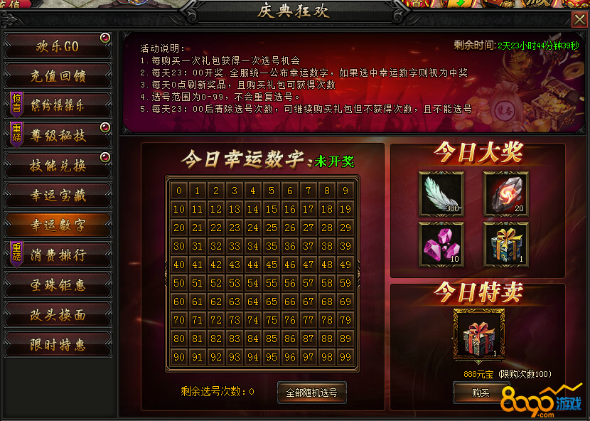 活动内容:活动期间,推出指定道具限时折扣出售,购买额外获得幸运数字,全服共100个数字,随机开一个,幸运玩家可得大量稀有奖励!