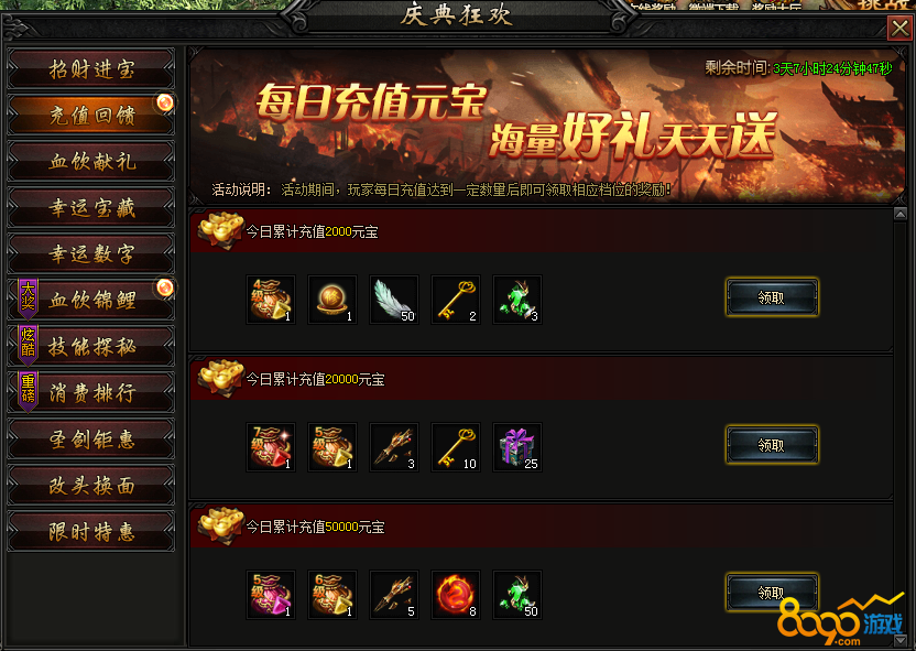活动内容:活动期间,每日充值达到一定额度后可额外领取相应档位的充值回馈。