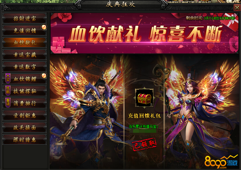 活动内容:活动期间,每日充值达到一定额度后领取超豪华血饮献礼一份。