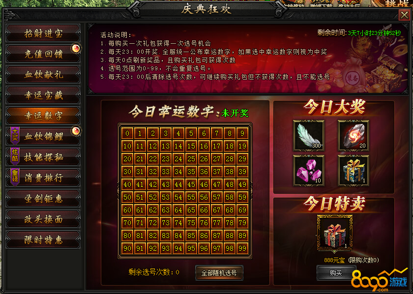 活动内容:活动期间,推出指定道具限时折扣出售,购买额外获得幸运数字,全服共100个数字,随机开一个,幸运玩家可得大量稀有奖励!