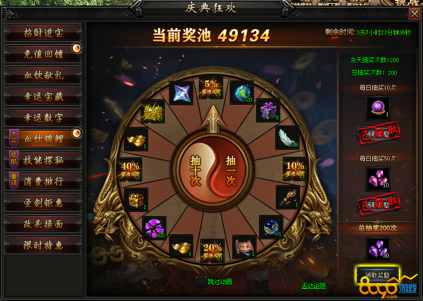 活动内容:活动期间,血饮锦鲤奖池投放海量元宝!参与大转盘必得珍贵道具,更有概率获得高额元宝奖励~