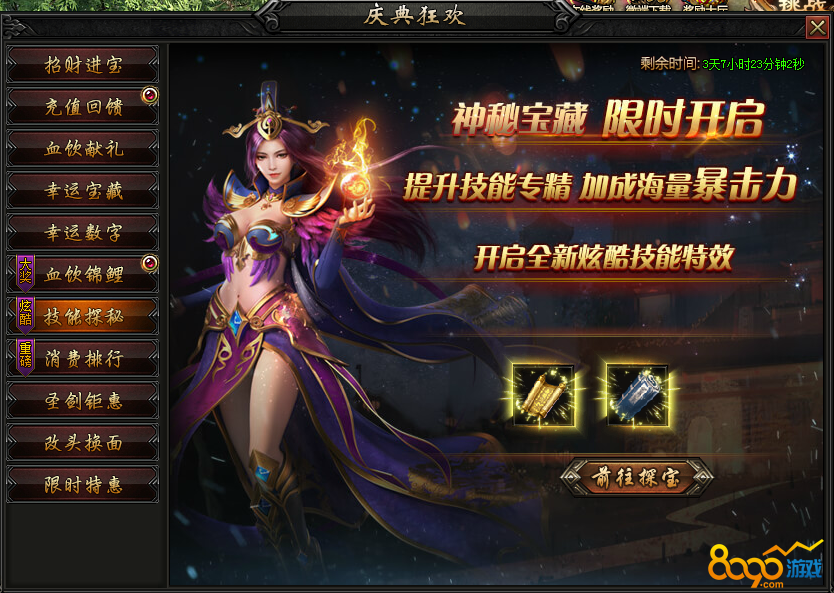 活动内容:神秘宝藏,限时开启!提升技能专精,海量暴击力加成!开启全新炫酷技能特效~