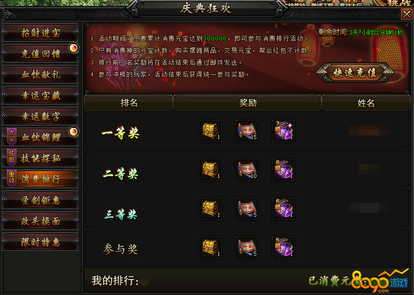 活动内容:活动期间,累计消费达到300000元宝即可参与消费排行活动,上榜玩家可获得专属奖励,稀有暴伤灵石、高转本职业极品装备震撼登场!