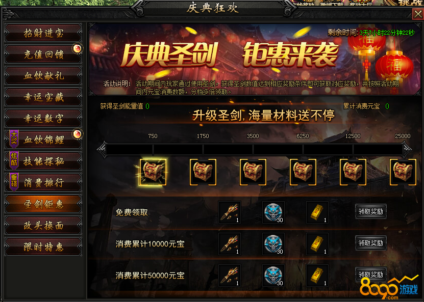 活动内容:活动期间内获得一定圣剑值,可领取对应奖励,并按照活动期间内元宝消费数额分多档领取,最高3倍领取哦!