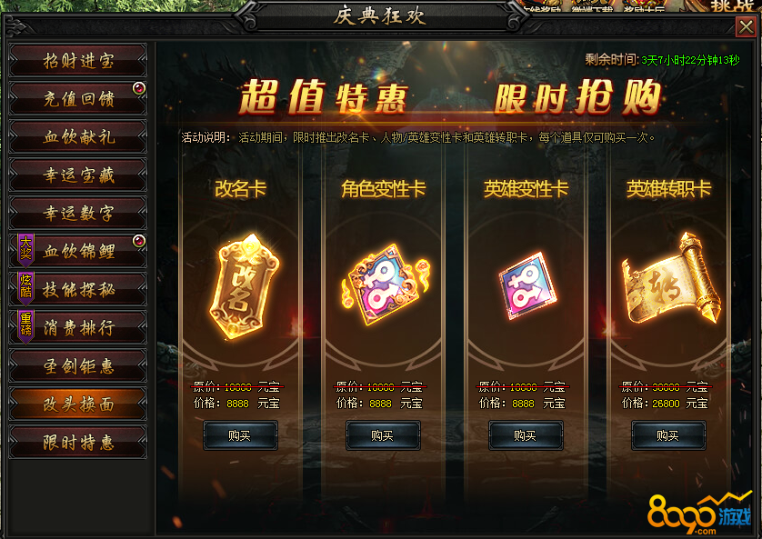 活动内容:活动期间,限时推出改名卡,人物/英雄变性卡和英雄转职卡,每个道具仅可购买一次。