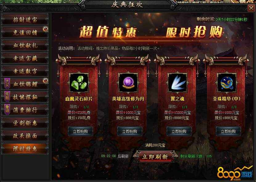 活动内容:活动期间,限时推出特价道具,物品每2小时刷新一次。