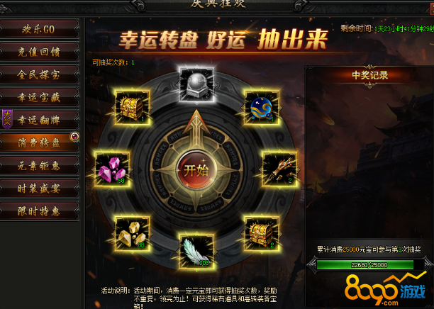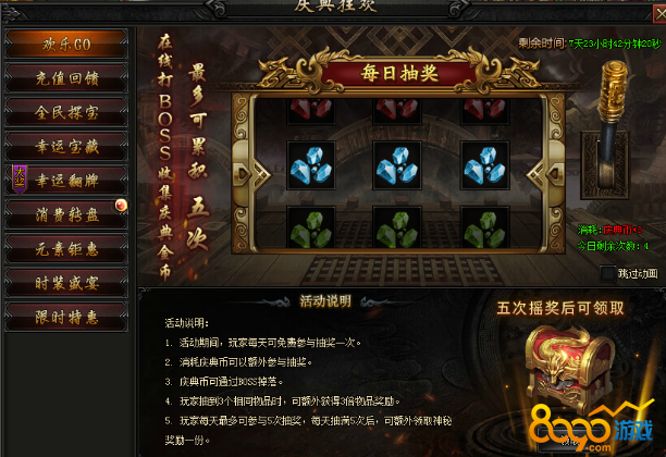 活动内容:活动期间,每天可以免费参与抽奖,打BOSS收集庆典币可以获得更多抽奖次数,惊喜奖励摇出来~