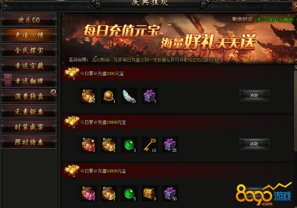 活动内容:活动期间,每日充值达到一定额度后可额外领取相应档位的充值回馈。