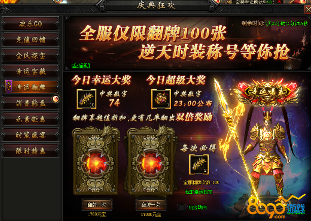 活动内容:全服仅限翻牌100张,逆天时装、称号超级大奖,还有幸运大奖等你来抢。
