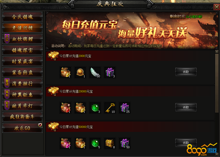 活动内容:活动期间,每日充值达到一定额度后可额外领取相应档位的充值回馈。